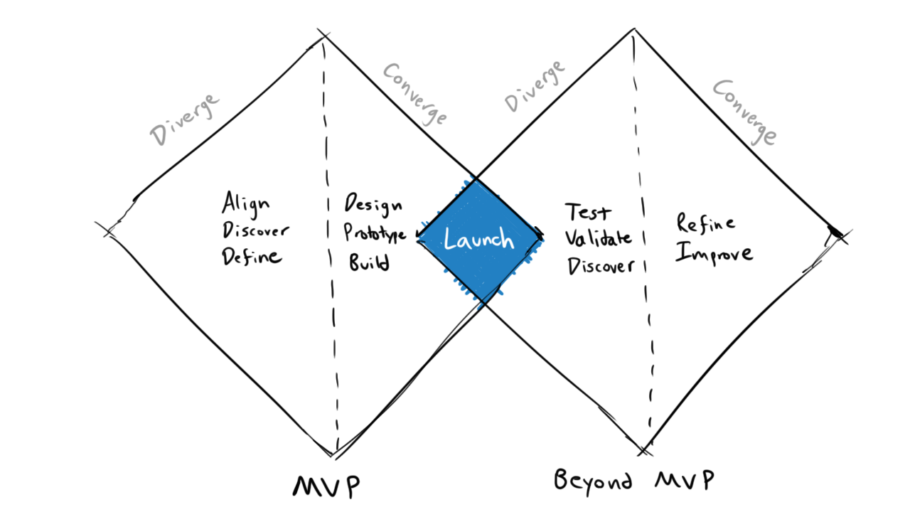 This is commonly known as the "reverse double diamond" approach, an antidote to the traditional design-centric double diamond model. This approach lends itself better to lean startup methodology as it encourages arriving at MVP sooner, and performing subsequent testing and validation in a production environment with real customers instead of relying on mockups and prototypes. This approach proved doubly effective at Ninety when coupled with continuous delivery on the engineering side: we were able to ship tremendous value to customers with every sprint cycle.