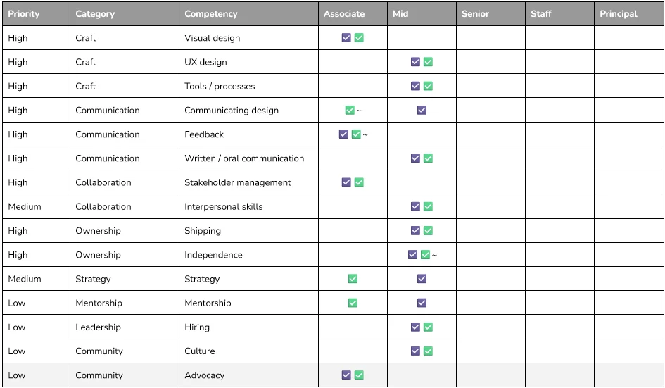 A competencies matrix used for the product design team.